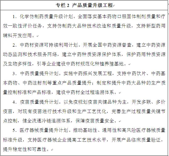 推動(dòng)重點(diǎn)領(lǐng)域質(zhì)量提升。全面提升基本藥物質(zhì)量水平,落實(shí)仿制藥質(zhì)量和療效一致性評(píng)價(jià)要求,完成國(guó)家基本藥物口服固體制劑的一致性評(píng)價(jià)任務(wù)。完善中藥質(zhì)量標(biāo)準(zhǔn)體系,提升中藥全產(chǎn)業(yè)鏈質(zhì)量控制水平,提高產(chǎn)品質(zhì)量均一性和可控性。實(shí)施國(guó)家醫(yī)療器械標(biāo)準(zhǔn)提高行動(dòng)計(jì)劃,開(kāi)展與國(guó)際標(biāo)準(zhǔn)對(duì)標(biāo),制定在用醫(yī)療器械檢驗(yàn)技術(shù)要求,推動(dòng)企業(yè)改進(jìn)產(chǎn)品設(shè)計(jì)、制造工藝和質(zhì)量控制,提升醫(yī)療設(shè)備的穩(wěn)定性和可靠性。加強(qiáng)藥用輔料和直接接觸藥品的包裝材料和容器的標(biāo)準(zhǔn)體系建設(shè),增加國(guó)家標(biāo)準(zhǔn)收載品種,鼓勵(lì)企業(yè)提高規(guī)范生產(chǎn)能力,提升質(zhì)量控制水平。推動(dòng)企業(yè)建立完善測(cè)量管理體系,促進(jìn)提質(zhì)增效。