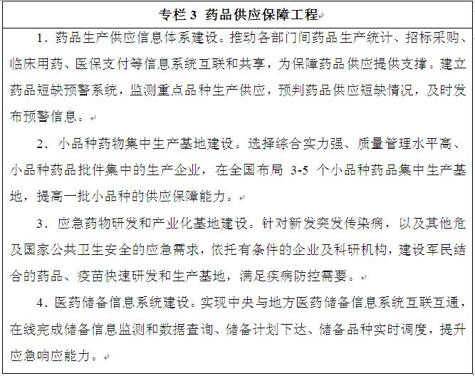 ——供應(yīng)保障。國(guó)家基本藥物、常用低價(jià)藥供應(yīng)保障能力加強(qiáng),臨床用藥短缺情況明顯改善,臨床急需的專利到期藥物基本實(shí)現(xiàn)仿制上市,國(guó)家醫(yī)藥儲(chǔ)備體系進(jìn)一步完善,應(yīng)對(duì)突發(fā)公共衛(wèi)生事件的應(yīng)急研發(fā)和應(yīng)急生產(chǎn)能力顯著增強(qiáng)。