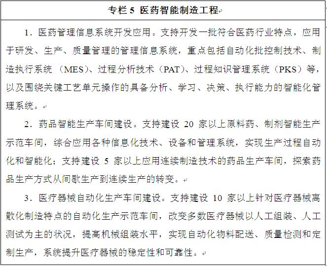 ——智能制造。到2020年,醫(yī)藥生產(chǎn)過(guò)程自動(dòng)化、信息化水平顯著提升,大型企業(yè)關(guān)鍵工藝過(guò)程基本實(shí)現(xiàn)自動(dòng)化,制造執(zhí)行系統(tǒng)(MES)使用率達(dá)到30%以上,建成一批智能制造示范車間。