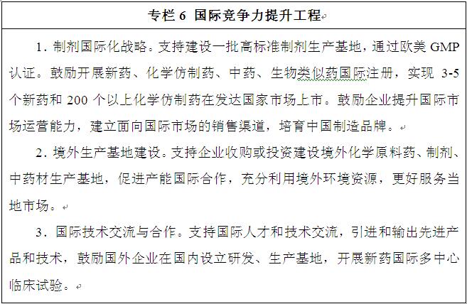 推動(dòng)國(guó)際產(chǎn)能合作。落實(shí)“一帶一路”建設(shè)的要求,鼓勵(lì)企業(yè)利用制造優(yōu)勢(shì),在適宜地區(qū)開(kāi)展收購(gòu)兼并和投資建廠。推動(dòng)化學(xué)原料藥產(chǎn)能國(guó)際合作,鼓勵(lì)企業(yè)在境外建設(shè)短缺中藥材生產(chǎn)基地。引進(jìn)和培養(yǎng)國(guó)際化人才,提高研發(fā)注冊(cè)、生產(chǎn)質(zhì)量、市場(chǎng)銷售各環(huán)節(jié)的國(guó)際化經(jīng)營(yíng)能力。